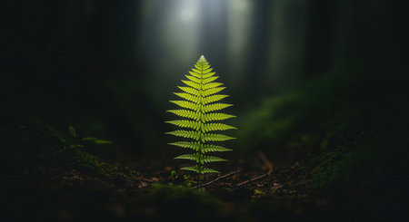 Vibrant green fern frond illuminated by a dramatic light beam cutting through the deep shadows of a mysterious forest, symbolizing life and growth.
