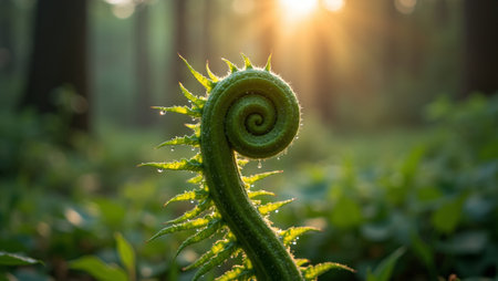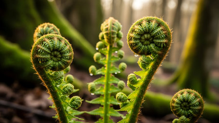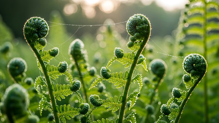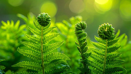 Fresh green fiddlehead ferns, adorned with dew, unfurl gracefully in a vibrant, sunlit forest, capturing nature's delicate beauty and new beginnings.