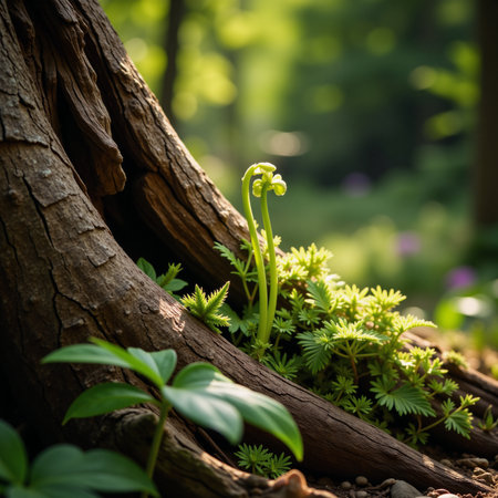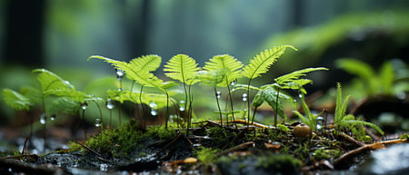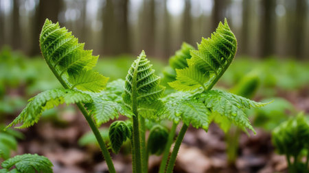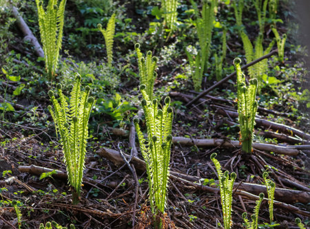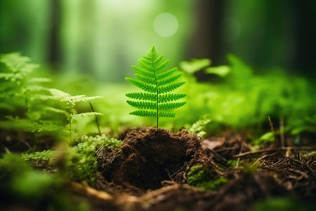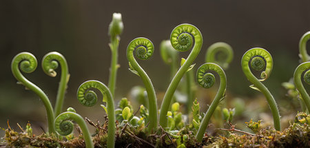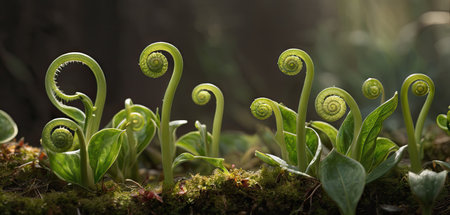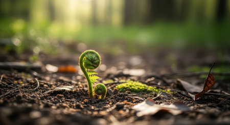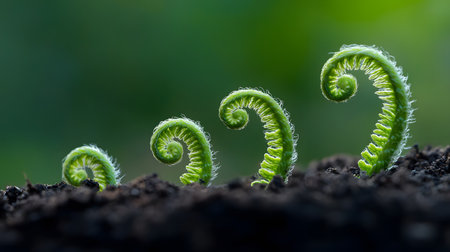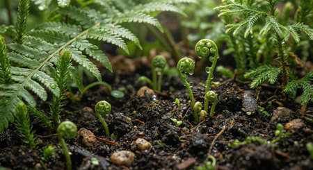 Plants are sprouting from the earth in a natural scene. Young ferns are emerging and show the process of growth. Soil and greenery surround the growing life forms in focus.