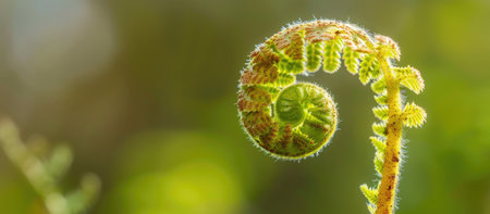 A close-up captures a fresh, vibrant green fern frond as it unfurls, revealing intricate patterns. The image displays a soft focus background, with sunlight illuminating the detailed textures and spiral shape. This image would be suitable for educational materials or nature-themed projects.