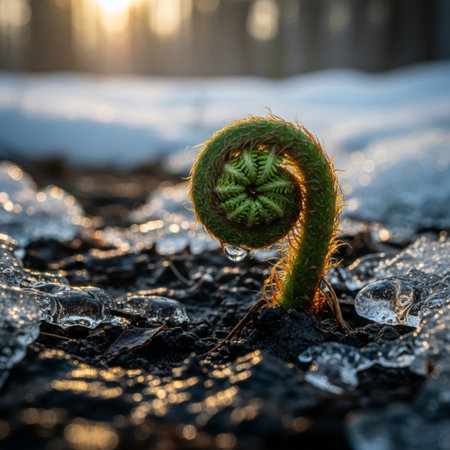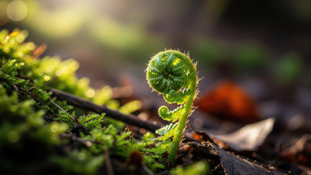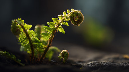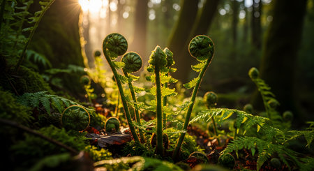 Young fern fiddleheads unfurl in the forest, glowing in the golden backlight of the morning sun. The vibrant green spirals stand out against the dark woodland background, symbolizing new life, growth, and the energy of spring.