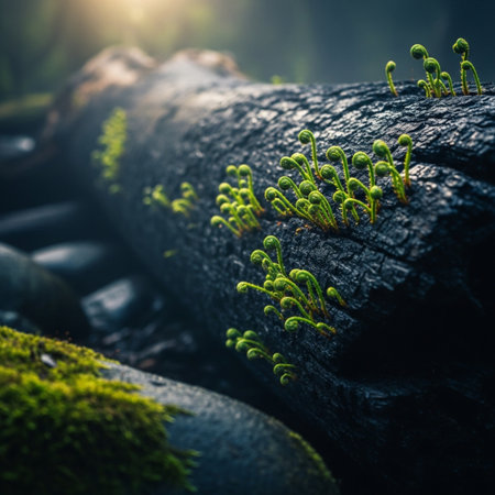 Delicate fern sprouts emerge from a mosscovered tree stump. The scene evokes a sense of serene forest life and gentle beginnings.
