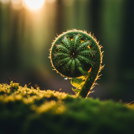 Close-up of young fern fronds unfurling in the gentle glow of sunrise, creating a serene natural scene.