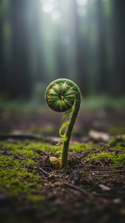 Fern frond unfurling with intricate patterns illuminated by diffused light