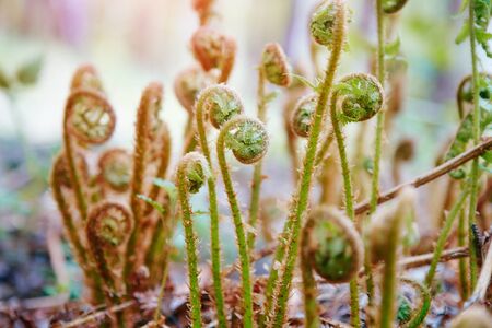 Young green shoots of ferns ,Polypodiophyta. Forest glade. Plants in nature. Spring season. New life. Green curls. Close up. Blurred background.Stems of coiled ferns