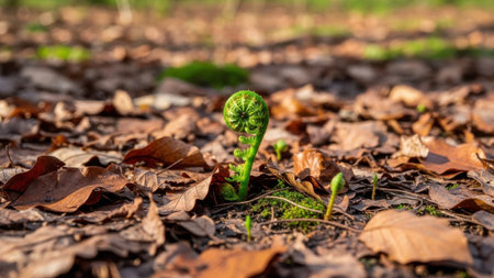 A group of fiddlehead ferns are seen emerging from the forest floor, surrounded by fallen leaves and moss. The ferns are in various stages of growth, with some still tightly curled and others beginning to unfurl, showcasing their vibrant green color and intricate details.