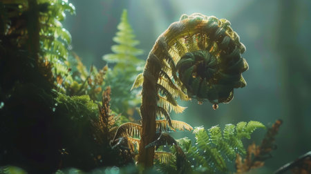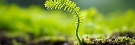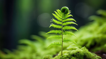 Young Green Fern Spiral Growing in Lush Forest, New Life and Growth Concept, Nature Background