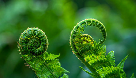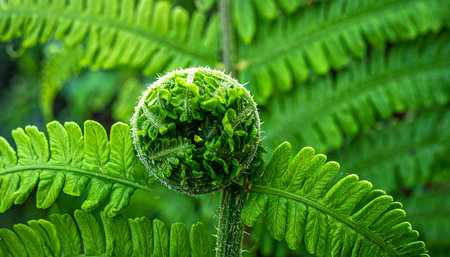 A close-up view of fresh green fern fronds unfurling, showcasing intricate spiral patterns. This vibrant image captures the beauty of nature's growth and renewal.