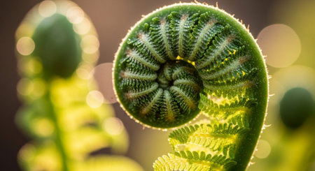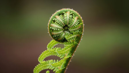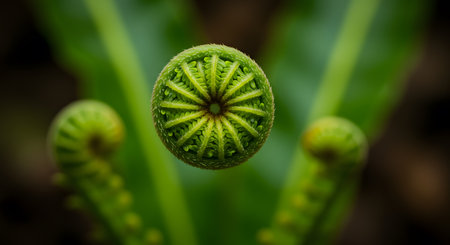 Macro Shot of Vibrant Green Fern Fiddlehead Unfurling with Perfect Radial Symmetry