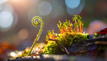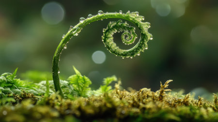 Young green fern frond unfurling in a spring forest with fresh water droplets glistening in morning sunlight surrounded by moss and wild vegetation in nature.