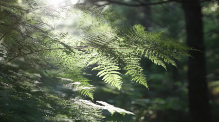 A beautiful close up of a vibrant green fern leaf bathed in ethereal sunbeams. The soft focus background shows a tranquil and lush forest environment.