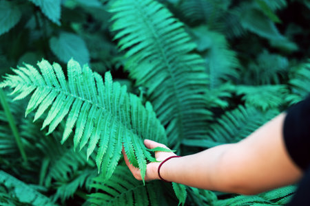 Woman's hand touching the green fern leaves