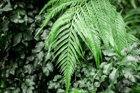 natural green background. tropical leaves texture background. green fern leaves in water drops after rain