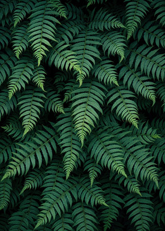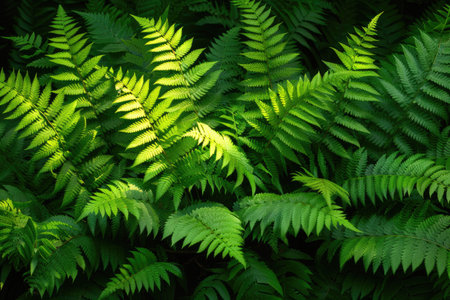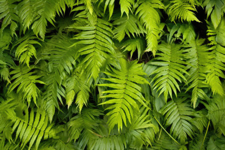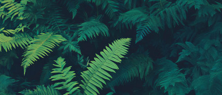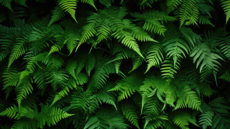 Exotic fern leaves arranged in layers in a dense, rich green pattern, tropical rainforest botanical background. generative ai