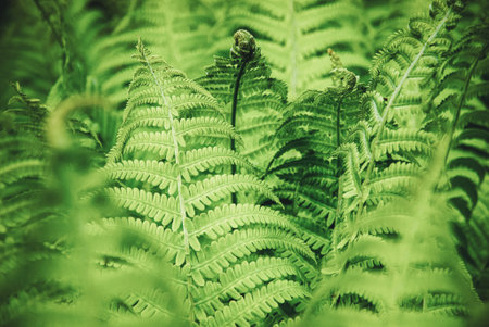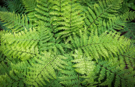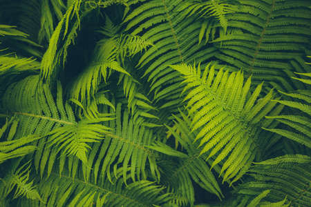 Natural green fern leaves background. Bright foliage making an ideal backdrop for organic products presentation. Environment conservation concept.
