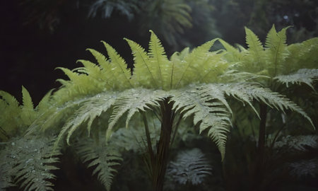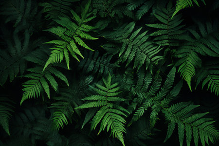 Close-up captures vibrant green fern fronds against a dark, blurred backdrop