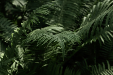Dark green fern texture background looks like cosmic jungle. Soft focus to unusual vibrant deep emerald color exotic plants. Abstract tropical backdrop of rainforest foliage textures for creative use