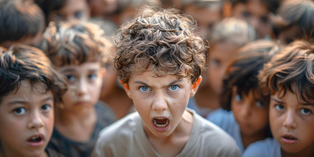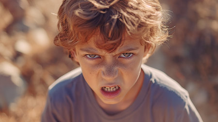 Little boy, furious, grimacing and acting aggressively