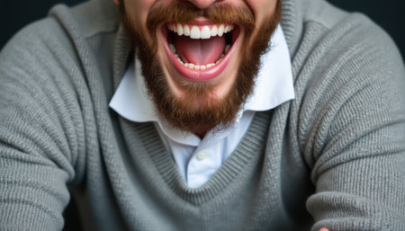 A close-up of a bearded man bursting into laughter, showcasing his bright smile and joyful spirit. His warm, engaging expression radiates happiness, inviting viewers to share in the moment of pure delight.