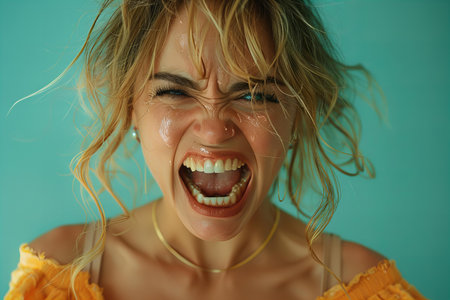 Digital image of young woman shouting in an exasperated tone on turquoise background