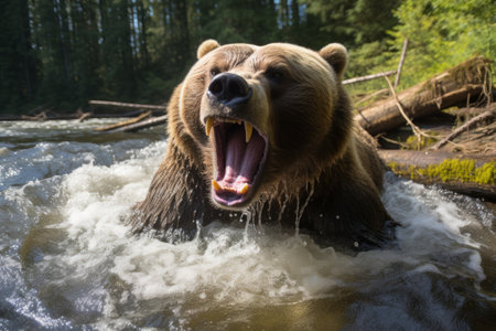 Brown bear showing aggression while roaring in a wilderness forest habitat