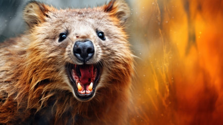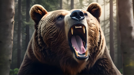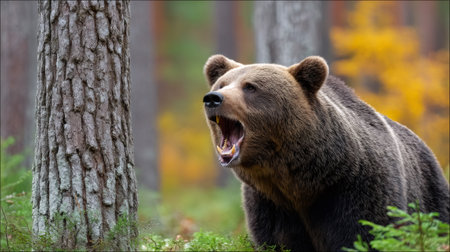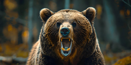 A detailed close-up of a ferocious brown bear roaring amidst the autumnal forest, capturing the raw power of wildlife.