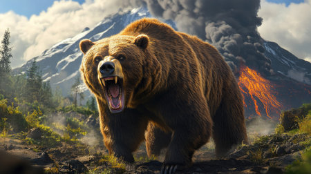 Grizzly Bear Roaring with Volcano Erupting in the Background
