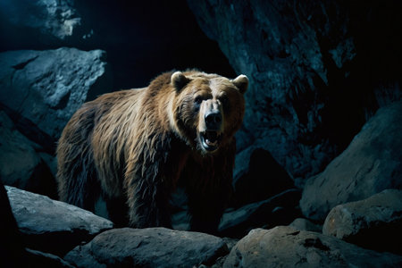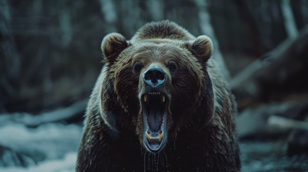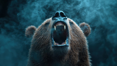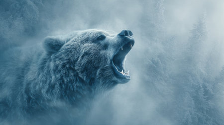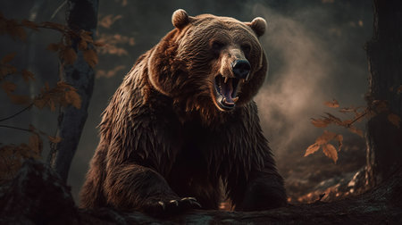 Majestic brown bear roaring in misty forest, dramatic cold atmosphere and frosty light