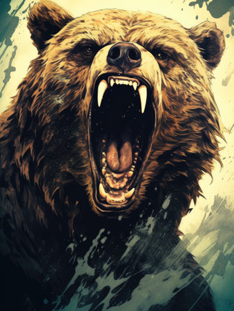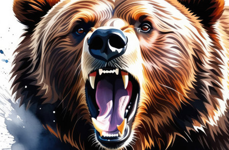 close up on muzzle of powerful North American brown grizzly bear roaring, watercolor illustration