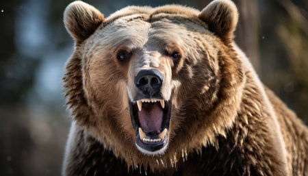 An intimidating brown grizzly bear roaring aggressively, showcasing wild predatory instincts in the forest.