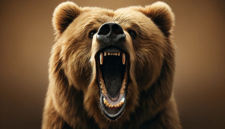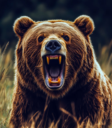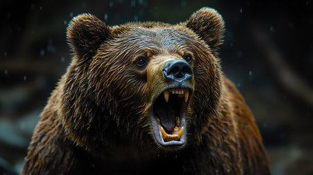 Roaring brown bear close-up. Powerful jaw and large sharp teeth of the bear. A bear's eyes reflect a sense of urgency or anxiety.