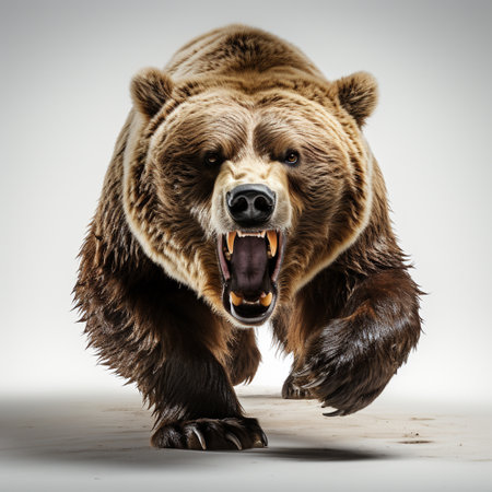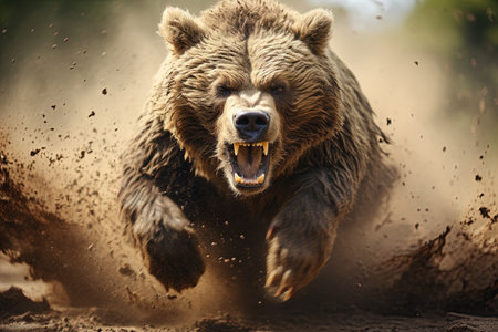 A captivating moment frozen in time as a majestic brown bear charges towards the lens, exuding power and grace.