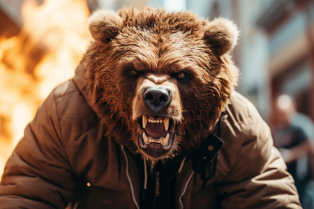 A large, angry bear with a brown fur coat is standing in front of a burning building. The bear is roaring and showing its teeth. The background is a bright orange flame.