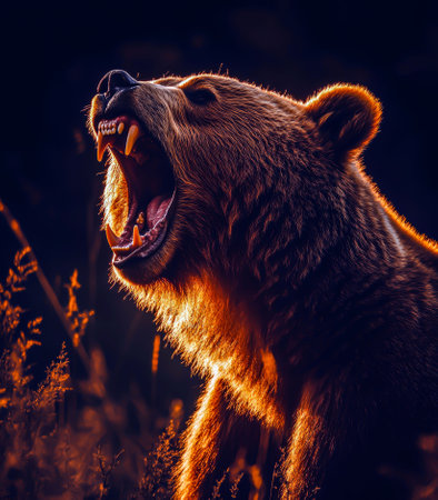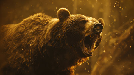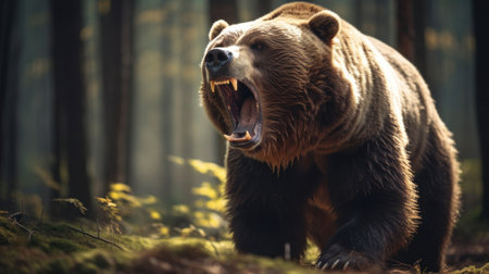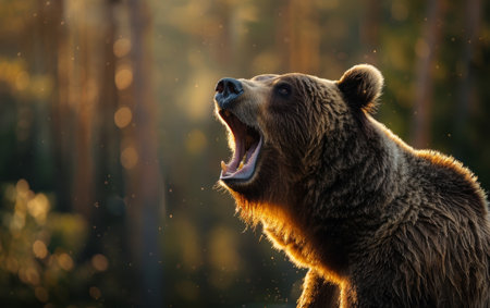 Captivating image of a wild brown bear roaring amidst the dense forest under warm evening light, invoking a sense of wilderness.