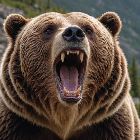 Intense Grizzly Growl Closeup view of a fierce bear with thick fur and sharp teeth against a mountain backdrop
