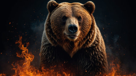 AI Generated. Grizzly Bear Fantasy Horizontal Poster with Ashes, Embers, and Flames on a Black Background Behold a Fiery Fantasy Wild Animal Collection, a Poignant Symbol of Climate Change, Global Warming
