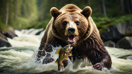 A powerful bear fishing for salmon in a wild river. brown bear catching a fish in the river in alaska, Ai generated