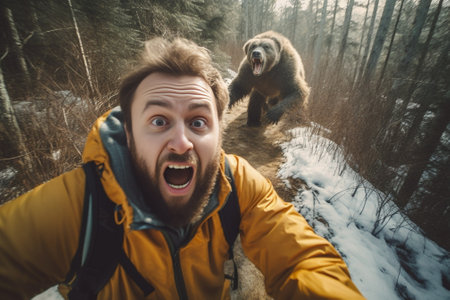 Generative AI : Happy man with backpack taking selfie portrait in winter frosty forest Smiling hiker climbing mountains Sport travel and technology concept