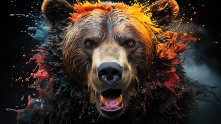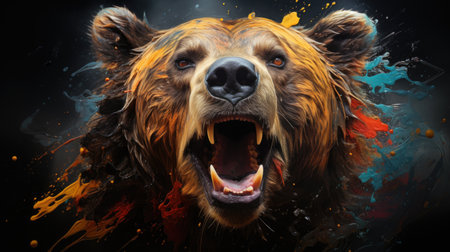 An angry grizzly's face with a mouth open . Print for T-shirts. Generative AI