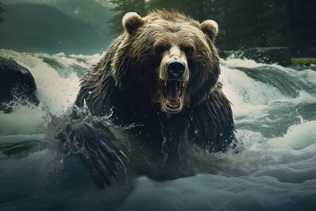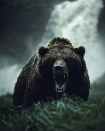 A powerful brown bear roars in front of a misty waterfall, showcasing its raw power and untamed nature This dramatic image captures the wild beauty of the wilderness AI Generative