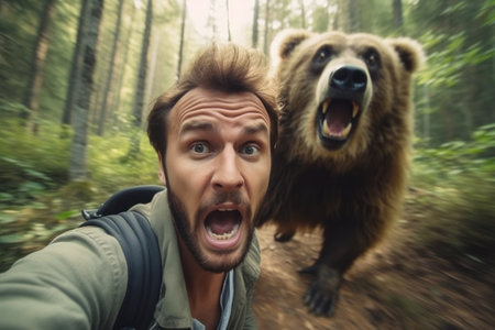An AI generated illustration of a man hugging a roaring grizzly bear in a forest