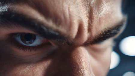 Close-up shot of a man's face, focusing on his intense eye and furrowed brow, conveying determination and focus.