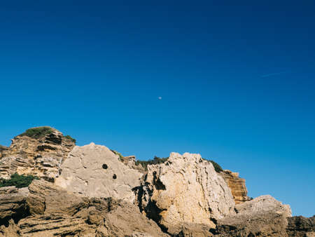 Moon rising above the Mediterranean sea with rocky coast in Savona, Italy