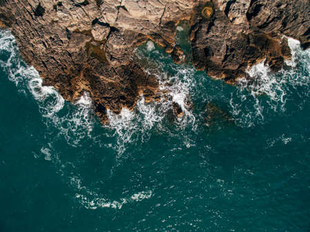 Aerial view. Top view of the turquoise clean sea water. In the upper right corner there is a piece of rock that is washed by the sea. Thailand, Phuket