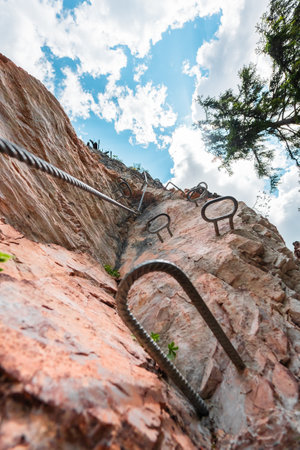 Bottom Up View of a Steep Via Ferrata Stone Wall Along a Climbing Path with Steel Wire and Steps