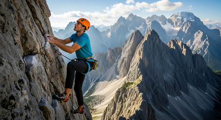 An adventurous climber in a tough ascent, donned in safety gear, navigates rugged terrain against a breathtaking natural vista on a sunny day.