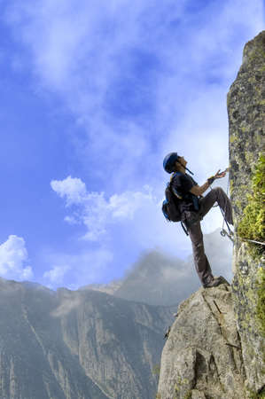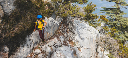 Woman in helmet and special equipment climbing high mountain via ferrata. Crimea.