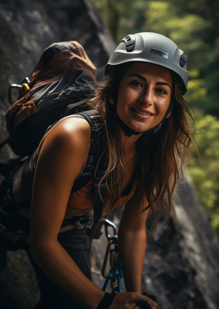 woman wearing helmet climbing gear smiles while standing rock dating profile cascading hair pictured shoulders moderator young full face touring shown athletic, generative ai