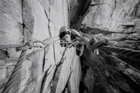 Female climber on a via ferrata - climbing on a rock in Austria Alps