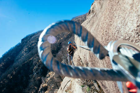 Close-up. Via ferrata. An unidentified person climbs in the mountains with the help of fixed safety ropes. Krakow-Czestochowa Upland, Poland